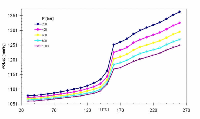 2- PVT Isobaric : Modern imalat proseslerine çok daha yakın olan isobaric PVT testidir. Bu test esnasında sıcaklık kontrollü olarak rampa fonksiyonu şeklinde değiştirilir, bu esnada ise basınç değeri belirlenen değerde sabit kalacak şekilde özgül ağırlık değeri hesaplanır. Özellikle Sigmasoft ya da Moldflow gibi analiz programları, prosesi daha iyi simule ettiği için isobaric PVT testinin sonuçlarını kullanmaktadır.